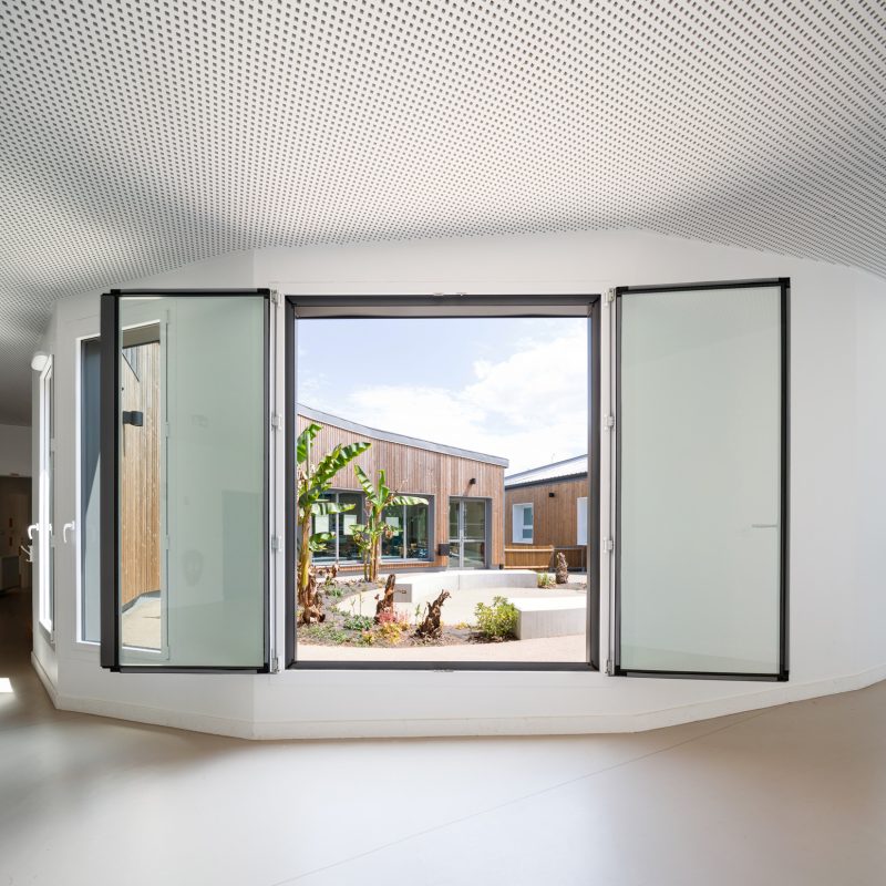 Dans le même esprit en ce qui concerne les espaces extérieurs, des ateliers de co-conception ont permis d’associer les usagers aux réflexions portant sur l’aménagement des cours de récréation et des espaces “crèche”. Cette étape collaborative a permis de nourrir le projet pour développer une école à l’image de ses occupants : transformer les pratiques et favoriser de nouveaux usages. Un espace potager en permaculture a été créé sur la cour maternelle pour permettre aux enseignants d’organiser des activités de découverte du vivant par la pratique du jardinage. La bananeraie, patio végétalisé au cœur de l’école, est une petite bulle de fraîcheur pour les “tout-petits”. Sa composition crée une atmosphère minimaliste, apaisée et permet de développer l’apprentissage en extérieur, les temps de lecture ou jeux calmes. Un amphithéâtre de verdure a été aménagé dans la cour d’activités des élèves de l’espace périscolaire devenant un espace scénique pour y danser, chanter, jouer de la musique, des pièces de théâtre…